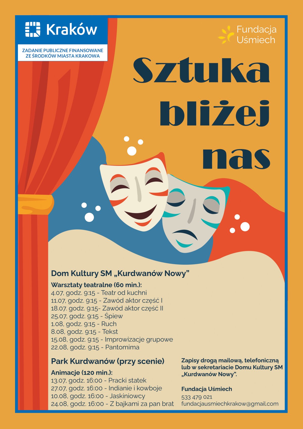 Mając na uwadzę zbliżające się wakacje stworzyliśmy program teatralno-integracyjny przeznaczony dla dzieci i rodzin. W dniu, 05.06.2023 r., rozpoczeła się realizacja zadania publicznego pt. "Sztuka bliżej nas". W ramach zadania, zorganizujemy dzieciom w wieku 6-12 lat, z dzielnicy Kurdwanów, czas wolny podczas wakacji w mieście, w okresie od 03.07.2023 r. do 27.08.2023 r.